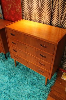 Teakbyrå med fyra lådor i måtten 75 x 36 cm höjd 80 cm Pris 850 kr. Frakt till Stockholm, Uppsala med omnejd möjlig.